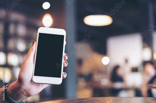 Mockup image of hand holding white mobile phone with blank black screen in cafe