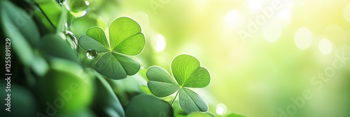 Mockup of a green clover leaves. St.Patrick 's Day. Spring natural background, banner. Fresh green clover leaves floating in soft glowing light. Banner, mockup, copyspace