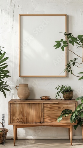 Mockup photo frame on the wooden cabinet with beautiful plants