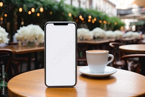 Mockup smartphone on a table in a cafe. Copy space. blank screen.