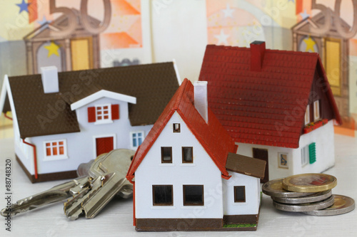 house, home, banknote, eur, euro, model, money, cash, coin, detached, plastic, loan, mortgage, key, cost, wood, rustic, few, three