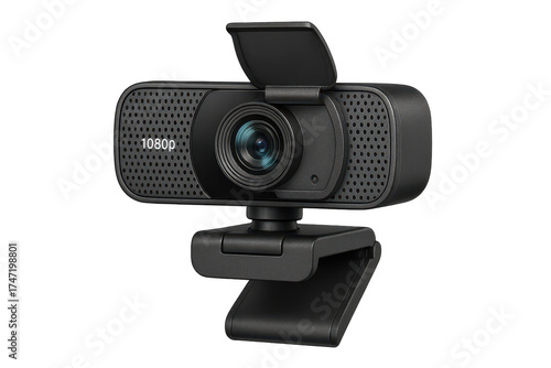 Modern 1080p webcam with open privacy cover isolated on transparent background
