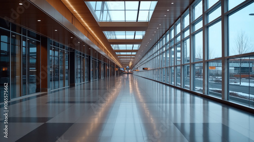 Modern airport terminal interior with long corridor and large windows, reflecting lights on polished floors, showcasing a bright and spacious architecture design.