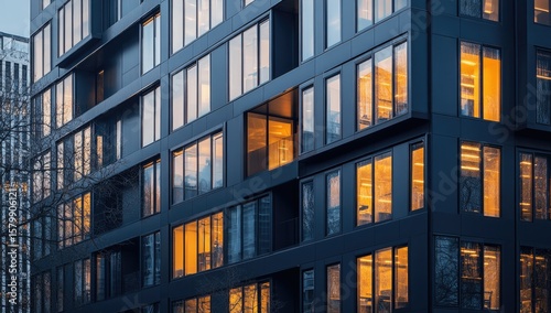 Modern apartment building facade at dusk. Warm light glows from windows
