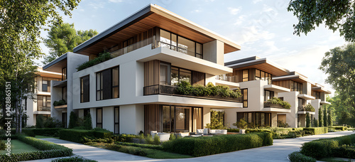 Modern apartment building with white and beige exterior walls, wooden balconies adorned with greenery.