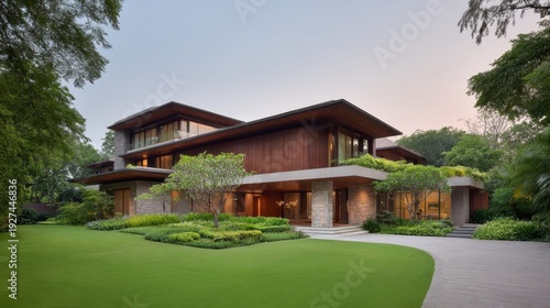 Modern architecture residential house surrounded by lush greenery at dusk showcasing sleek lines and natural materials in serene setting