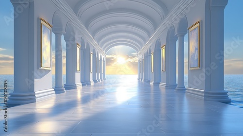 architecture, gallery, art, modern, white, column, sunset, ocean, view, interior, design, hallway, light, bright, minimalist, contemporary, building, luxury, style, elegant, roomy, peaceful, tranquil, serene, aesthetic, beautiful, picturesque, inspiration, dreamy, abstract
