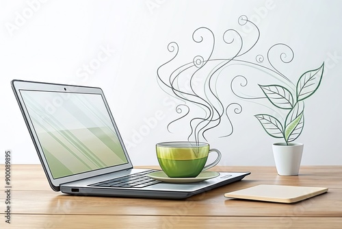 Modern Asian style minimalist desk with sleek laptop, steaming cup of green tea, and scattered notes, evoking a sense of focused online learning atmosphere.