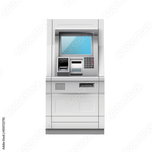 Modern ATM machine with touchscreen and card slot, isolated on white background. Perfect for banking and finance-related visuals.