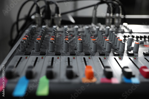 Modern audio mixing console, closeup. Music equipment