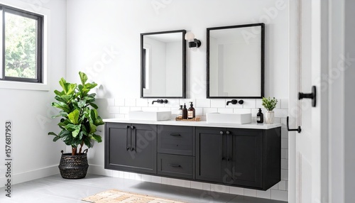 bathroom, vanity, mirror, sink, black, white, plant, modern, design, minimalist, clean, contemporary, decor, lighting, wall, faucet, cabinet, home, interior, house, cleanliness, luxury, decorating, style, space