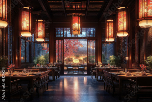 Modern, beautiful Chinese restaurant. Small tables and chairs. The restaurant has decorative elements.