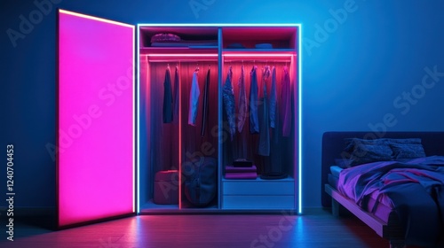 closet, bedchamber, interior, design, modern, furniture, lighting, neon, style, clothes rack, room, home, decor, night, bed, clothes, lamp, minimal, contemporary, stylish, glow, bright, blue, pink, purple, dark, cosy, light, comfortable, house, space, decorating, living, aesthetic, luxury, dream