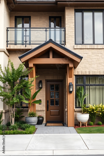 house, home, exterior, architecture, modern, building, residential, property, design, facades, brick, entrance, door, balcony, window, landscaping, plant, pathway, contemporary, luxury, style, structure, urban