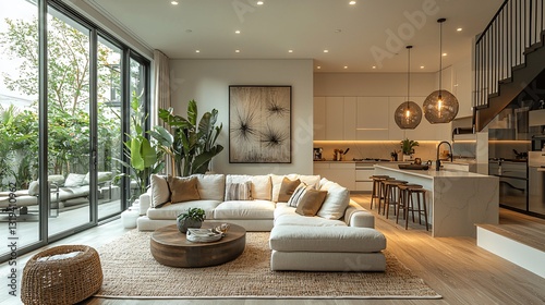 Modern Bright Living Room with Open Floor Plan and Natural Light Featuring Cozy Furniture and Green Plants