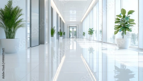hallway, office, modern, bright, clean, minimalist, contemporary, roomy, plant, window, light, interior, design, architecture, commercial, building, corridor, reflective, decor, plant, white, smooth, polished, tile, floor, glasses, door, neutral, empty, empty space, professional, reception, entranceway, business, corporate, elegant, stylish, fresh, simple, minimal