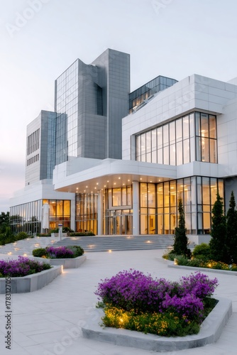 building, architecture, modern, exterior, office, glasses, urban, facades, landscape, city, corporate, business, headquarter, entrance, contemporary, structure, sky, city landscape, commercial, downtown, design, sleek, white, concrete, plant, flower, purple, spring, new, day, empty, step, property, urban life, financial, future, beautiful, clean, light, elegant, professional, real estate, sky background, nobody, daytime