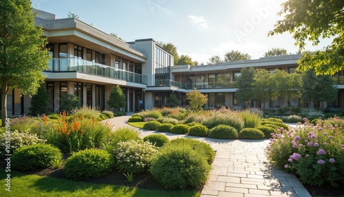 modern architecture, beautiful, landscaping, pathway, peaceful, environment, nature, scene, green, plant, flower, bed, building, exterior, residential, complex, aged, care, service, assisted, living, support, facility, horticulture, tranquil, atmosphere, sunlight, daytime, shot, entrance, area, garden, design, stone, path, tree, shrub, calmness, serenity, well-being, nursing, home, senior