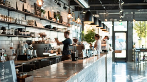 Modern Cafe with Sleek Decor, Baristas at Work, and Space for Promotional Text