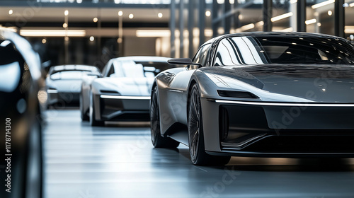 Modern cars elegantly arranged in an industrial showroom, showcasing sleek designs and advanced technology, embodying innovation and automotive excellence.