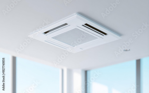 Modern ceiling cassette air conditioner installed in white room near bright window for cool fresh air and comfortable office atmosphere