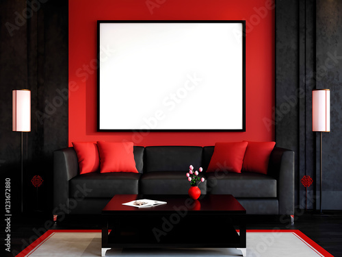 Modern Chinese and Japanese style living room, red and black colors with blank frames mockup, 300dpi, 3d illustration, interior design.