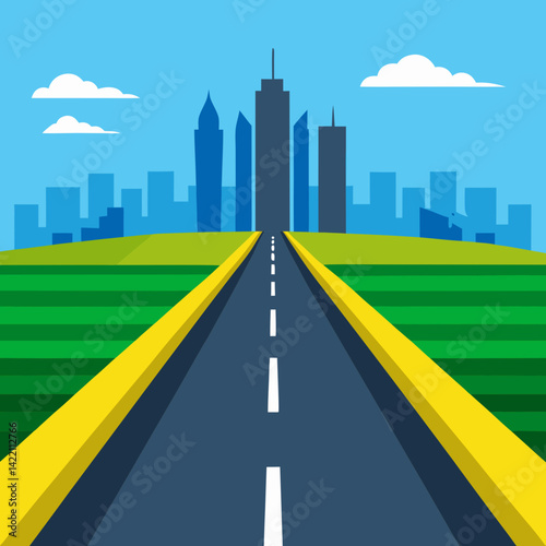 city, bypass, road, modern, vector, street, lamp, sky, blue, clear, illustration, minimalist, grass, green, perspective, depth, design, urban, highway, traffic, asphalt, travel, route, line, marking, clean, smooth, view, horizon, architecture, driveway, landscape, infrastructure, scene, daylight, neat
