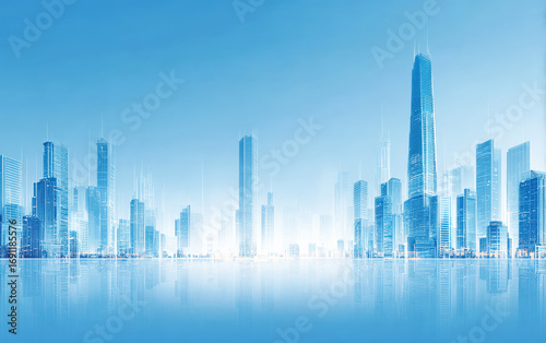 Modern city skyline with tall buildings reflecting in water