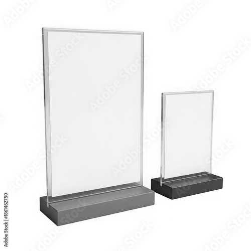 Modern clear acrylic display stands in various sizes isolated on transparent background
