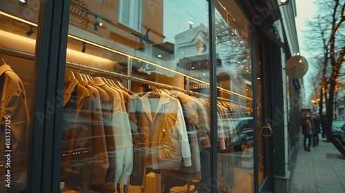retail, store, window, display, fashion, clothing, jacket, coat, hanger, rack, boutique, urban, trendy, stylish, modern, apparel, shopping, consumerism, purchase, shopaholic, catwalk, runway, model, designer, luxury, garment, textile, fabric, material, shop, window shopping, consumer, client, shopper, buyer, salesperson, assistant, service
