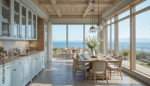 kitchen, coastal, ocean, view, natural, light, dining, table, chair, decor, flower, window, roomy, bright, serene, elegant, contemporary, design, interior, furniture, retreat, relaxing, cosy, atmosphere, inviting, home, architecture, nature, landscape, tropical, harmony, style, clean, wood, wall, ceiling, panoramic, lifestyle, summer, calmness, elegance, vacation, brightness, gathering