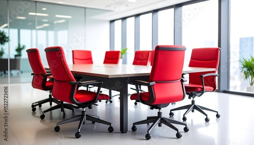 modern, conference, room, meeting, red, chair, table, office, business, workspace, interior, design, contemporary, professional, corporate, empty, bright, light, window, glasses, view, clean, minimalist, functional, efficient, professionalism, meeting room, furniture, organised