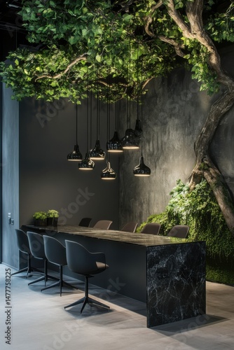 conference, room, interior, tree, pendant, light, design, natural, contemporary, style, modern, table, chair, office, workspace, architecture, decor, plant, leaf, tree branch, trunk, wall, marble, texture, black, grey, green, furniture, fixture, illumination, meeting, space, workplace, environment, indoor, setting, element, material, surface, pattern, shadow, detail, perspective, luxury, elegance, minimalism, aesthetic