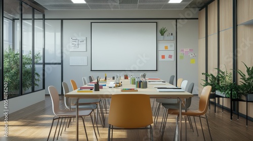 Modern conference room with a large table, chairs, and a screen, perfect for meetings and presentations in a professional setting.