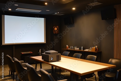 conference room, meeting room, presentation, projector, screen, blank screen, wooden table, business, professional, interior design, office space, technology, meeting, corporate, stylish, contemporary, minimalist, supply, business meeting, photo, furniture, chair, table, empty, blank