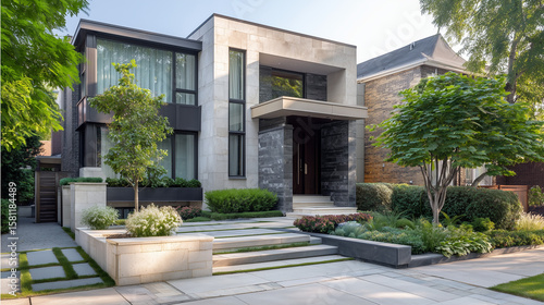 Modern contemporary front yard exterior with clean lines, minimalistic garden, and stylish architecture design, perfect for real estate and home decor concepts.
