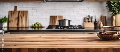 Modern culinary haven. Empty wooden kitchen counter with rustic accents. Homey kitchen elegance. Blurred background of cozy cooking space