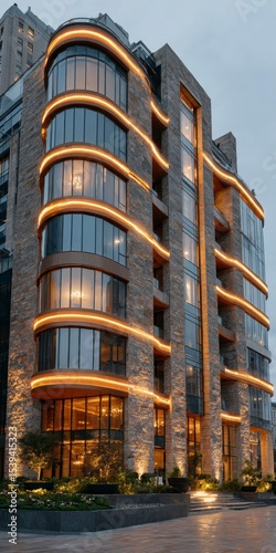 Modern Curvy Building Dusk Exterior Illuminated Windows Night Cityscape Architecture