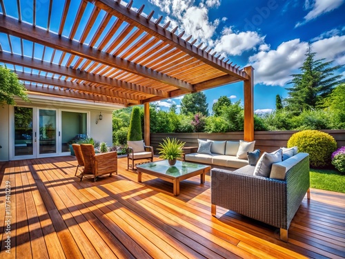 deck, pergola, stain, renovation, backyard, patio, landscaping, summer, relaxation, home improvement, design, modern, contemporary, garden, furniture, shade, relaxing, comfortable, stylish, clean, minimalist, natural light, photo, photo, image, hi-res, royalty free, bricolage