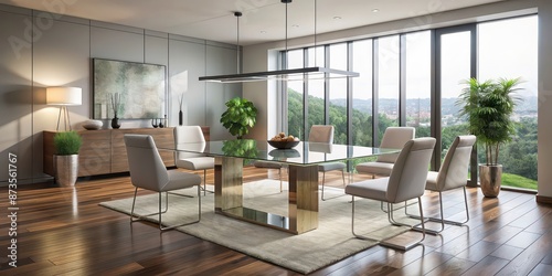 Modern dining room featuring a sleek glass table , contemporary, luxury, interior, design, elegant, decor, stylish