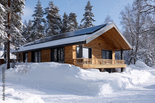 Modern eco-cabin nestled in the winter landscape with solar panels