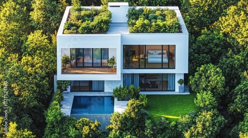 Modern eco-friendly house nestled in a lush forest setting with a green rooftop garden and swimming pool.