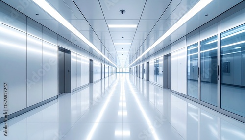 hallway, corridor, modern, empty, clean, bright, futuristic, sterile, interior, architecture, design, light, roomy, perspective, minimalist, smooth, sleek, white, metal, glasses, door, window, ceiling, lighting, illuminated