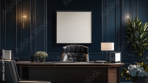 office, modern, executive, interior, design, frame, blank, wall, dark, blue, wood, desk, chair, leather, lamp, table, plant, flower, elegant, sophisticated, luxurious, stylish, contemporary, workspace, professional, room, decor, style, home, business, corporate, furniture, lighting, aesthetic, ambience, atmosphere, minimalist, clean, line, detail