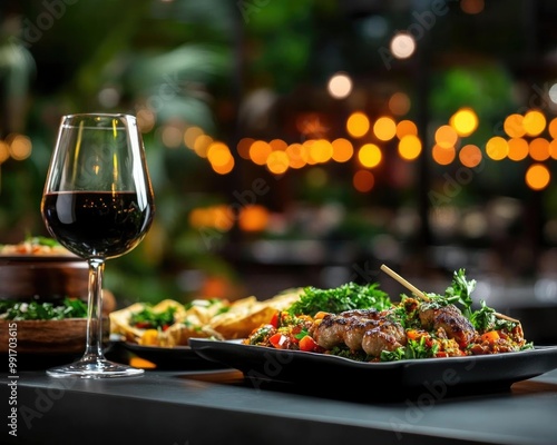 Modern fusion of Middle Eastern and Latin American flavors in a tapas platter, served in a sophisticated hotel lounge, fusion cuisine, global tapas