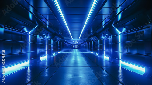 corridor, futuristic, neon, blue, light, technology, architecture, design, science fiction, modern, shadow, reflections, illuminated, space, perspective, structure, empty, sleek, detail, metallic, clean, symmetry, depth, pattern, contemporary, hallway, interior, high technology
