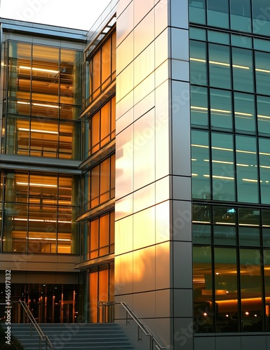 Modern glass facade building at sunset