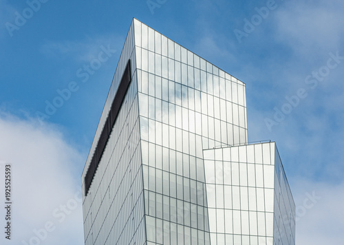 Modern glass office buildings with reflective windows and geometric architecture against a cloudy sky in Vilnius, symbolizing corporate growth, urban development