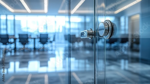 glasses, door, office, handle, modern, contemporary, business, corporate, meeting, room, interior, architecture, design, metal, chrome, blue, cool, tone, professional, clean, minimal, access, opportunity, workspace, building, space, workplace, commercial, environment, sleek, metallic, detail, texture, background, blurred, sharpened, sharp, image, photo, photo, stock