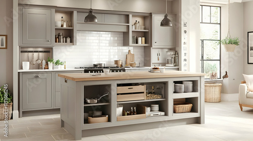 Modern Grey Kitchen Design with Island and White Tile Backsplash